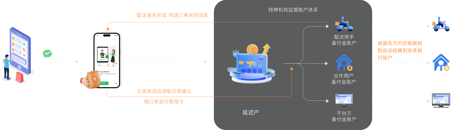 系统自动完成资金分配和结算,大幅减少人工干预和错误,提升交易速度和准确性,支持秒级分账能力,资金在交易完成后即时分配到商家、骑手等合作方账户。