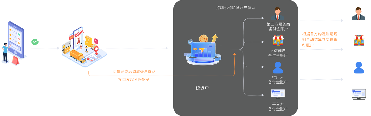 轻量化api接口对接,系统根据订单规则自动分账、记账、对账,高效便捷。叠加担保交易、合并支付付、会员钱包等丰富的功能,满足各类营销场景。